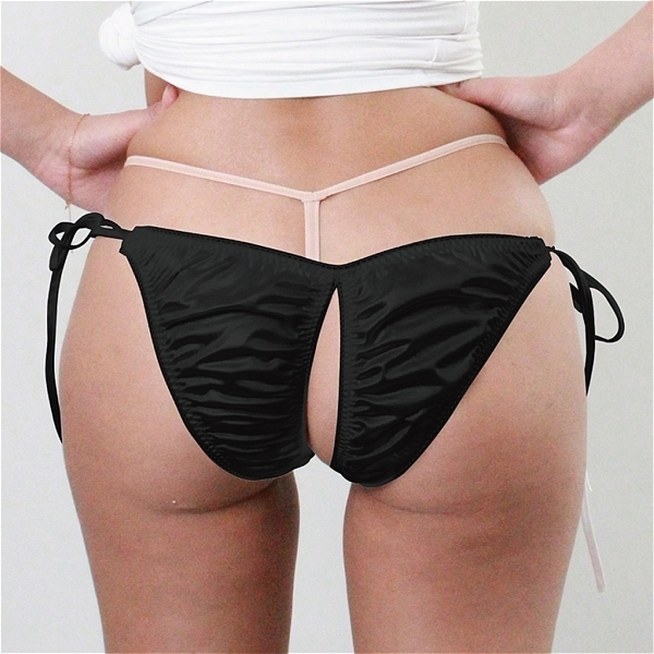 > 光沢が有り肌触りの良い生地にレース付き脇ヒモ股ワレFB Lサイズ ブラック