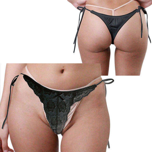 > 光沢生地にレース付き脇ヒモTバック Lサイズ ブラック