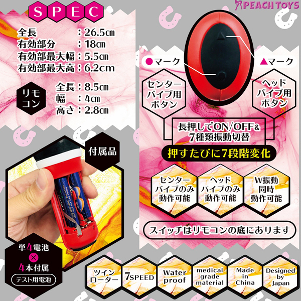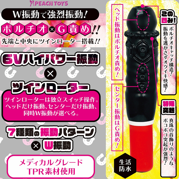 とにかくヤバイ「YAVIBE!」4弾目は、幅5.5cmの超極太な凹凸突起&ポルチオキャッチ構造の黒光りボディでとことん責める!先端と中央から発する6Vの強烈振動が奥とGスポを同時に刺激。 ヤバイほどの快感が全身を駆け巡る!素材はハリ弾力に優れたメディカルグレードTPR仕様。 7種類の振動を搭載し、お手入れしやすい生活防水式!振動は独立操作可能◎単4電池を4本使用