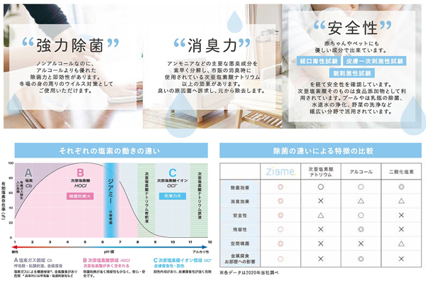 肌に触れても安心な弱酸性!除菌消臭のダブルパワーを兼ね備えた、水で溶かして作る粉末タイプの「Ziame(ジアミー)」。