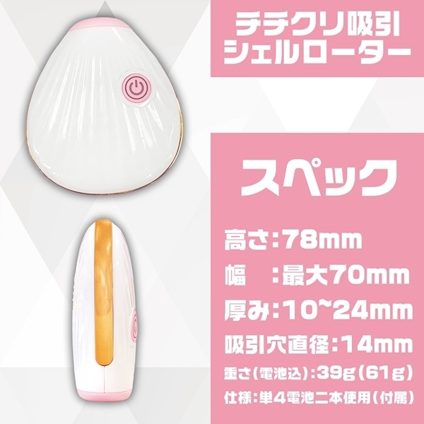 見た目がユニーク!貝殻のような形でコンパクトな「チチクリ吸引シェルローター」。 クンニや舌での愛撫のような感覚が楽しめるので、クリや乳首などの凸部分にお使いいただけます♪5段階の吸引強弱機能でマックス毎秒100振動!軽くて持ち運びやすく、初心者から上級者まで幅広くお楽しみ頂けます。 高速クンニでの舐めを体感するもよし、吸われる感覚を自分で調整しながらチクビ開発やクリ吸引の初体験にもどうぞ♪