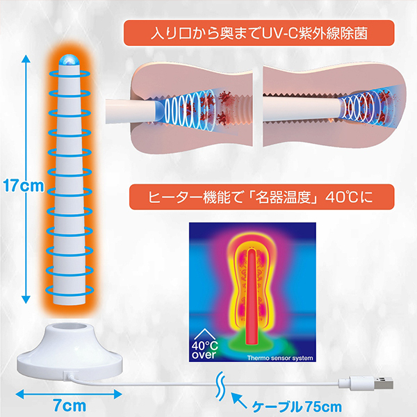 オナホウォーマーの悩みをまとめて解決!超強力UV−C除菌でクリーン&ホットなオナホを今すぐご提供!ケーブルのわずらわしさから解放するコードレスな魔法のスティックです!超強力UV−Cで除菌はばっちり。 充電式コードレスで、どこにでも持ち運べて、しかも温度センサー内蔵だから、たった5分で人肌温度にしたあとは放置OK。