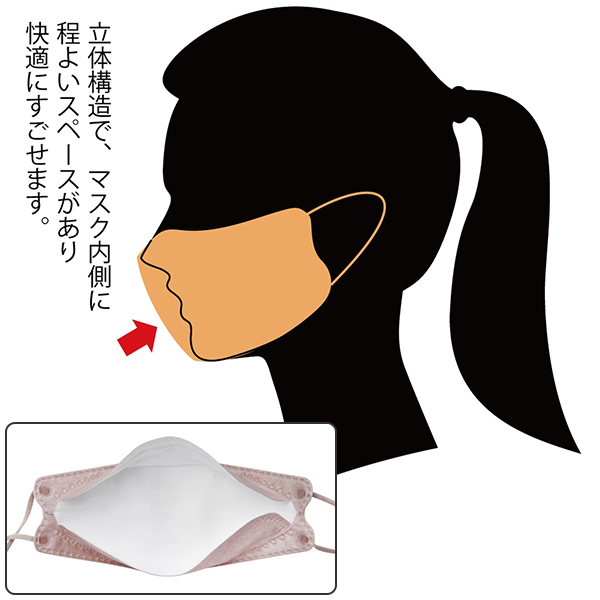 立体構造でマスク内部にスペースが出来るため快適にすごせます。