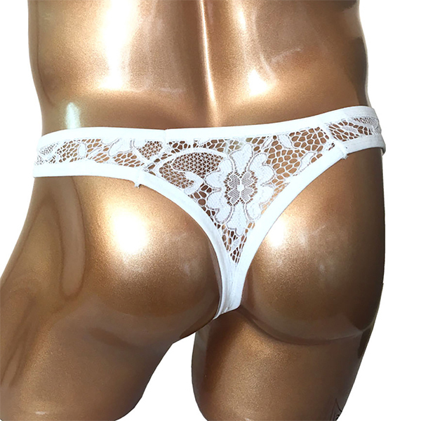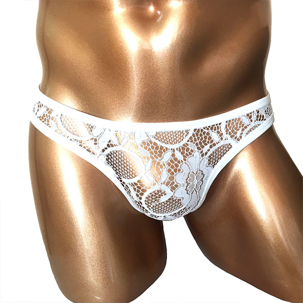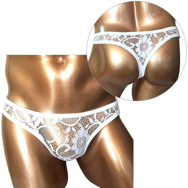 伸縮性があり涼しげな素材のレースビキニがバッドダディブランドから新登場!前後左右、全部シースルーでスケスケ♪ブラジリアンスタイルのお尻にくい込む、白い花柄レースがキュートな男性用のレースビキニです。