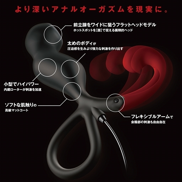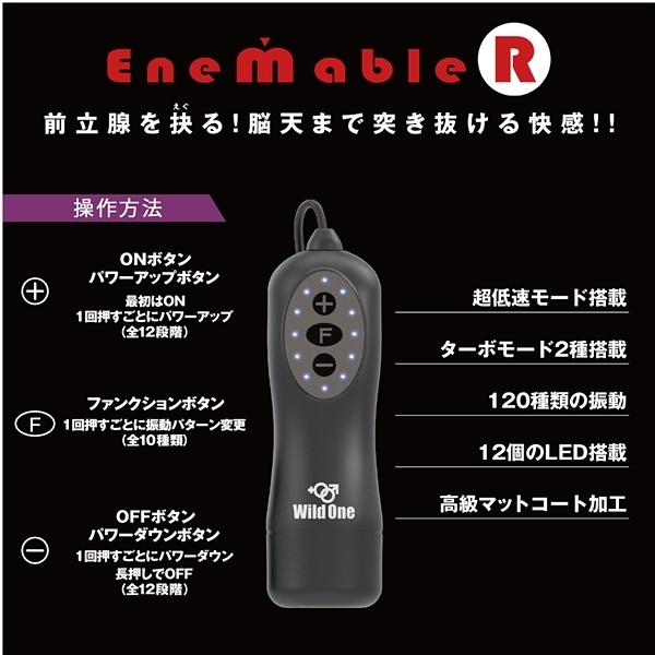 お手軽さが人気の前立腺開発グッズ「エネマブルR」に上級者タイプが新登場!3段階に可動するアームが自由自在に会陰部を刺激する♪12段階の強弱と10種類の振動パターンによる120種類の振動が前立腺をえぐる!初心者から上級者にまで愛される洗練されたフォルムが前立腺を的確に刺激しながら悶絶のドライオーガズムへと誘います。 全体的に太さもあり、挿入時の圧迫感も同時に楽しめる逸品♪3段階に可動するフックで会陰部への刺激も自由自在にお楽しみ頂けます!