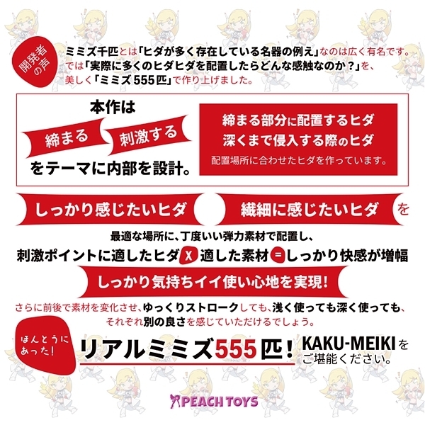 「締まる」「刺激する」をコンセプトに内部設計された、リアルに555本のヒダを配置した非貫通オナホ「KAKU−MEIKI MIMIZU555」です。 ミミズ千匹とは「ヒダが多く存在している名器の例え」なのは広く有名ですが、では「実際に多くのヒダヒダを配置したらどんな感触なのか?」という疑問に答えるべく美しく「ミミズ555匹」で作り上げました!隆起するコブに突起もしっかりと配置し、どんな挿入角度でも、ゆっくりなストロークでも速いストロークでも楽しめる極上ヒダ仕様のオナホとなっています♪内部は挿入直後に配置された大玉4つがゴリっとした圧迫感を与え、ストロークのたびにゾリ感と竿全体への刺激が感じられます。 最奥での狭穴ゾーンに裏筋を刺激する専用の突起!どの挿入深度でも楽しめるという、とにかくヒダにこだわったオナホになっています。