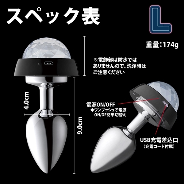 ステンレス製のアナルプラグでテール部分には電飾LEDライトが埋め込まれていて、サウンドに反応し光がアクションする画期的なプラグです♪カラフルにアクションするパリピな様子に気分は上々!プラグ部分はスチール素材で重量感があり、3サイズ展開のなかでこちらはLサイズとアナル上級者向け♪電源はUSB充電式で飾部分は防水ではないためプレイ後の洗浄時にはご注意ください。