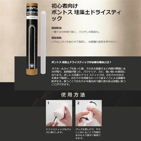 ポントス珪藻土ドライスティックは、おもちゃの水分を奥まで吸収し、おもちゃを何度もひっくり返すことによる損傷を防ぎます。