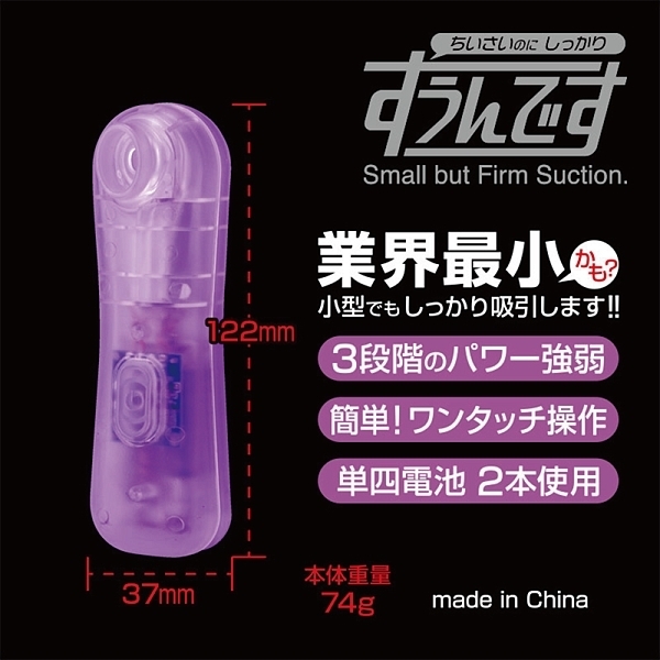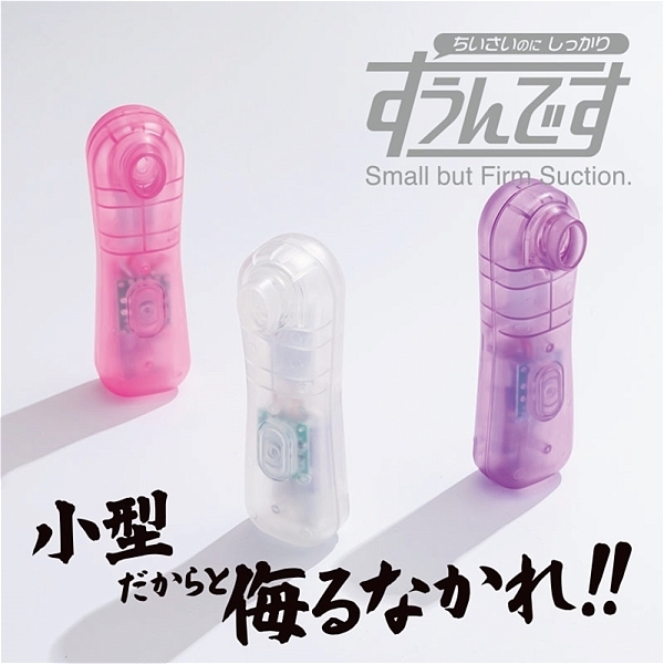 現在、流行中の吸引系ローター。 その中でも最小・最軽量・最安を目指して作られたのが、この「すうんです」です。 単四電池2本を入れ、電源スイッチ長押しでスタート。 あとは電源スイッチを短押しすることで、3段階のパワー強弱をお楽しみいただけます。 本製品は小型で簡易的なモデルですが、十分な吸引力を発揮。 手軽に、コンパクトに、吸引ロータを楽しむことが可能です。 最小・最軽量・最安にこだわった吸引ローター「すうんです」。 小型だからと侮らずに、お試しください。 ●カラー:スケルトンパープル