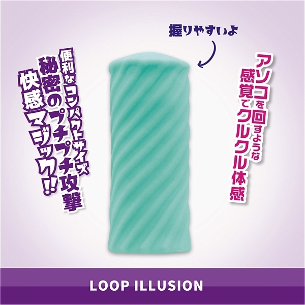 回技の魔法でフラフラに!コンパクトサイズの本体に大小のプチプチの刺激と横ヒダの引っ掛かりで搾り取る360度全方向刺激型、表面のスパイラルな溝は握りやすいだけでなく裏返して使用できるリバーシブルな簡易グッズ。