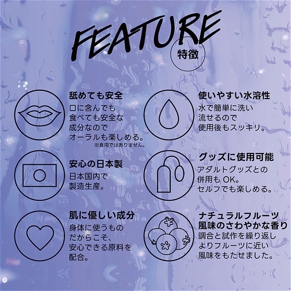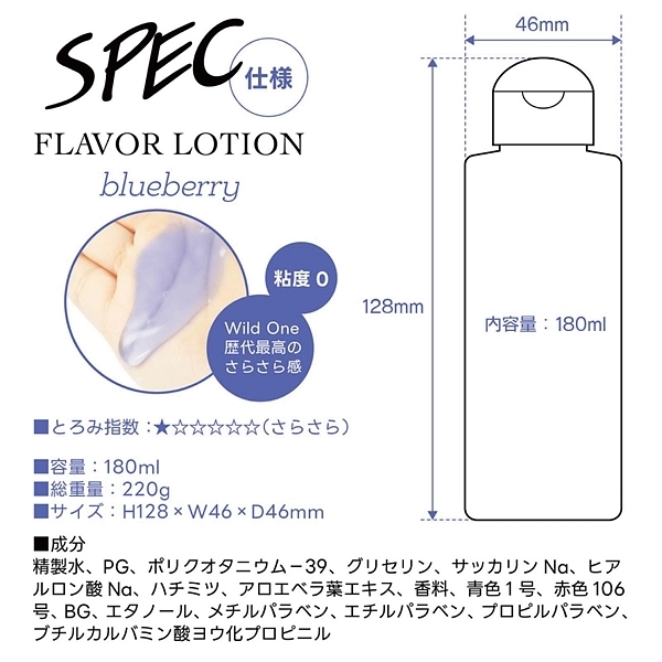 ブルーベリー。 フルーティーな味と香りで新感覚プレイ!ワイルドワン女子が企画・開発した女性のためのフレバーローション!安心安全の国内素材で水のように「超さらさら」、フルーツみたいに美味しい水溶性ローションです!<成分>精製水、PG、ポリクオタニウム-39、グリセリン、サッカリンNa、ヒアルロン酸Na、ハチミツ、アロエベラ葉エキス、香料、青色1号、赤色106号、BG、エタノール、メチルパラベン、エチルパラベン、プロピルパラベン、ブチルカルバミン酸ヨウ化プロビニル。