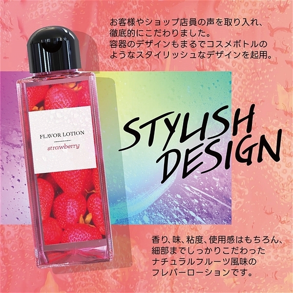 ストロベリー。 フルーティーな味と香りで新感覚プレイ!ワイルドワン女子が企画・開発した女性のためのフレバーローション!安心安全の国内素材で水のように「超さらさら」、フルーツみたいに美味しい水溶性ローションです!<成分>精製水、PG、ポリクオタニウム-39、グリセリン、サッカリンNa、ヒアルロン酸Na、ハチミツ、アロエベラ葉エキス、香料、赤色2号、BG、エタノール、メチルパラベン、エチルパラベン、プロピルパラベン、ブチルカルバミン酸ヨウ化プロビニル。