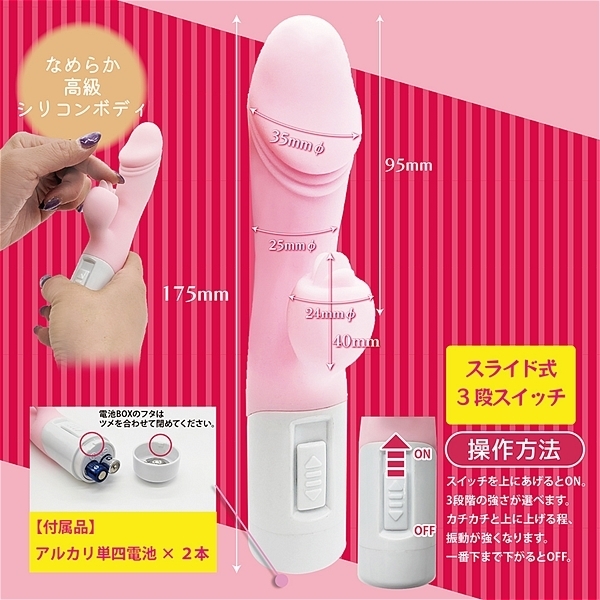 シンプルに使いやすくスマートな形状。 のけぞるほどキモチイイ快感バイブができました。 初心者でも使いやすい細身の形状。 高級シリコンのすべすべ感がクセになります。 快感ポイントをしっかりと刺激するのけぞりカーブがキモチイイ!先端に搭載された強力モーターがカリ高ヘッドを振動させ快感が響き渡る!段々の凹凸がついた竿がゾリゾリと刺激!出し入れする度に快感が訪れます。 ●カラー:アクメピンク