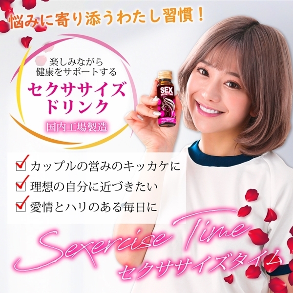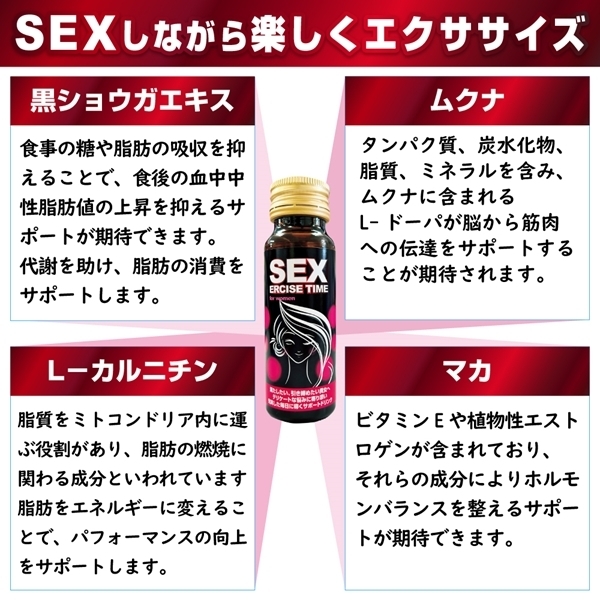 心身ともに自分を高めたい貴女のためのサポートドリンクです♪業界初の「セクササイズ」を実現しました!黒ショウガエキス末、マカエキス末、ムクナエキス末、L−カルニチンフマル酸塩の4つの厳選成分を配合しています♪毎日にメリハリをつけたい方にぴったりのドリンクです!悩みに向き合いたい方、理想の自分に近づきたい方にもおすすめ♪SEXERCISE TIMEは、身も心もスッキリとした充実した日々を目指し、愛情とハリのある毎日へと導きます。 【お召上がり方】1日1本を目安に、よく振ってお召し上がりください♪【ご注意】原材料が沈殿を生じたり、時間の経過によって液色が変化する場合がありますが、品質には問題ありません。