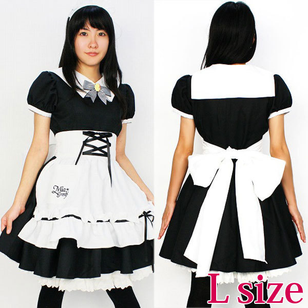 人気メイドカフェのオフィシャル制服「ミアリラクゼーション制服(L)」。 ボリューム感たっぷりのパフスリーブとフリルスカートがとっても可愛い、黒白カラーのメイドコスチューム!キュートな付け襟とエプロンも必見です。