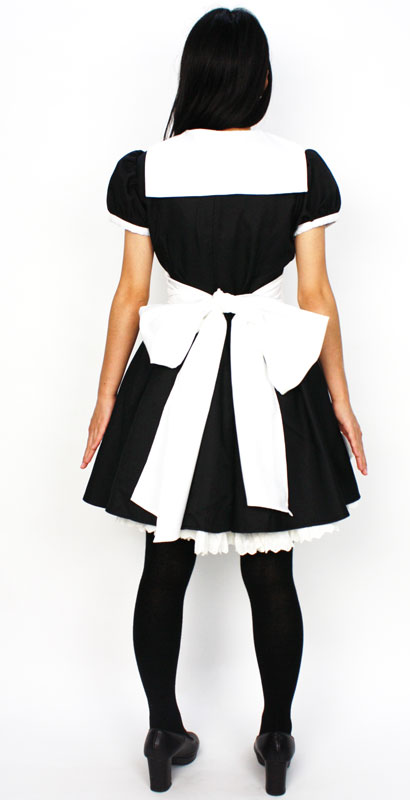 Lサイズ:B87〜98cm・W70〜77cm 丈:ワンピース80cm(袖丈17cm)・ペチコート50cm セット内容:ワンピース(後ろファスナー、袖パフスリーブ、全円スカート、内側に襟固定用のボタン付)・エプロン・ペチコート(裾レース付、ウェストゴム仕様)・カチューシャ・ブローチ(安全ピン付)
