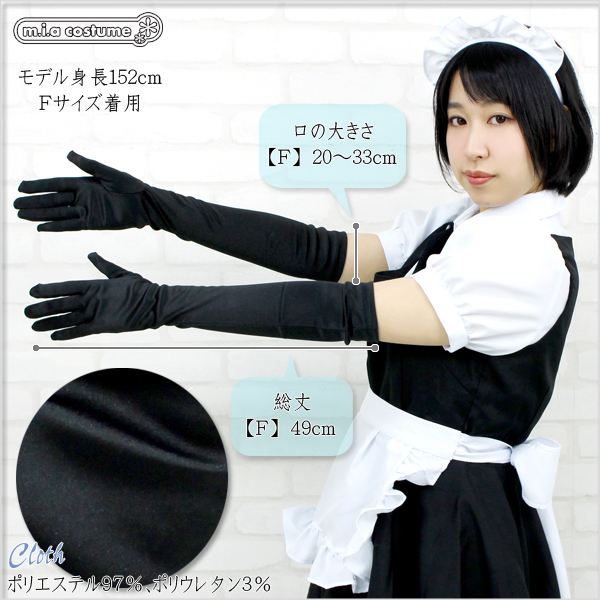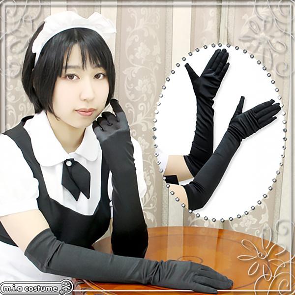 プリンセスドレス、メイド服、チャイナドレスなどのコスプレやワンピースにも合わせられるロング手袋(黒)。 サテン生地なので高級感もUP!きちんと手にフィットし、着け心地もとってもいい感じです!長さは肘上くらいになります。 手袋は意外と重宝するもの!他のコスプレとも相性は抜群です。