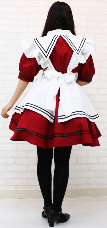 セーラー服を彷彿とさせるエリ付きのメイドコスチューム(エンジ)。 肩紐にふんわりフリルが付いたハイウエストのエプロンと、お揃いカチューシャが可愛い!ワンピースのスカートは、ゆったりとした動きやすい長さのデザインです。