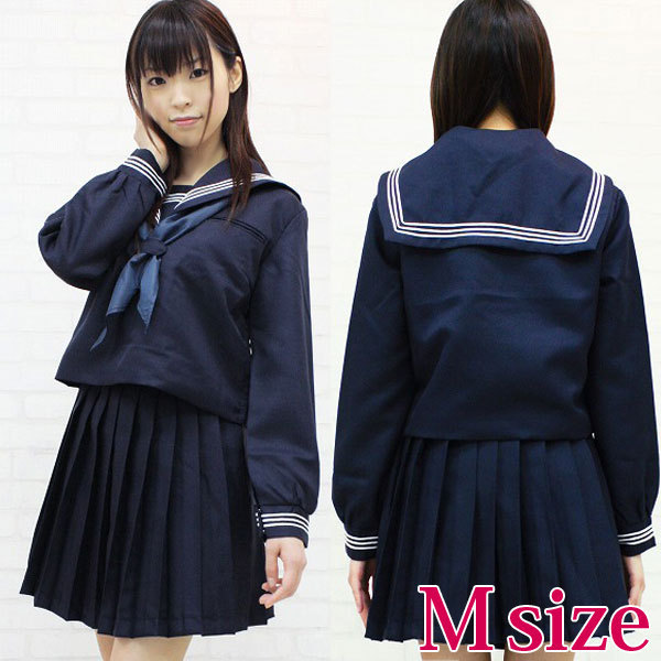 制服コスプレの定番!ネイビーカラーの長袖セーラー服。 上着はサイドファスナー仕様、スカートはアジャスター付き、もちろんスカーフもセットです!しっかりとした作りで、クオリティの高いお嬢様系制服コスチュームです。