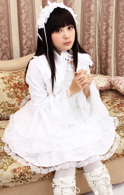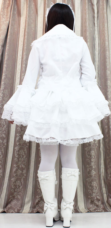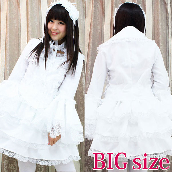 たっぷりのフリフリレースでボリューム感を持たせた、真っ白なチュールメイド服(BIG)。 ボリューミーなフリル使いがゴージャス!大きめの衿は取り外しが可能。 キュートなヘッドドレスもセットになった、ゴスロリ系コスプレ衣装です。