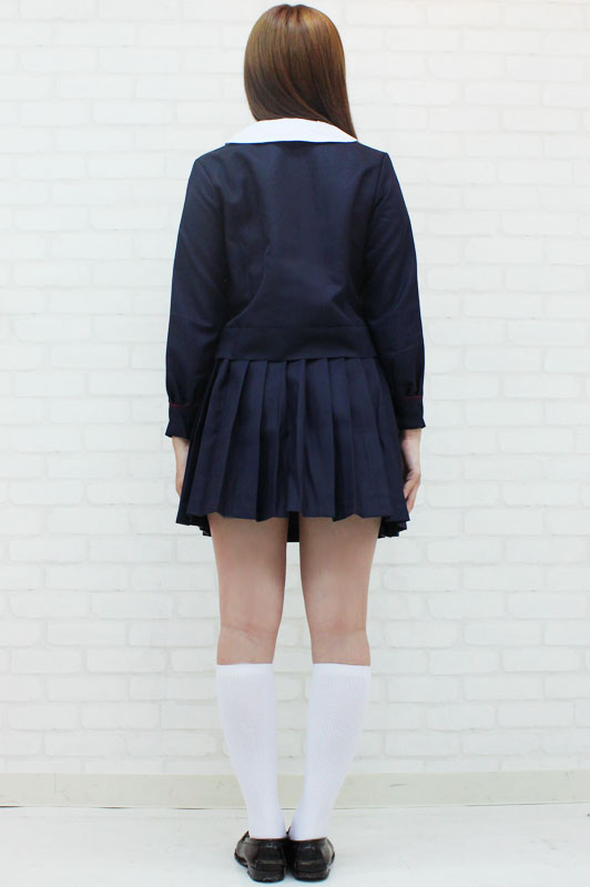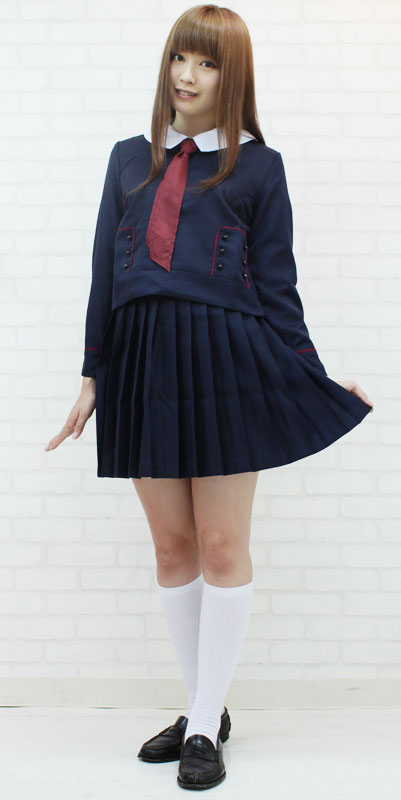 白襟とエンジ色のスカーフがベストマッチ!可愛い濃紺の制服コスプレセットです。 丸首が可愛いトップスはサイドファスナー仕様、白襟はスナップボタンで取り外し可能!トップス両サイドにはエンジ色のパイピングの中に、6つのボタンをあしらった飾りポケット付き!プリーツスカートはアジャスターで調節可能です。 素敵なお嬢様を思わせる、デザイン性に富んだ冬服タイプの制服コスチュームセットです。
