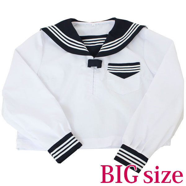 定番コスプレを自分流にアレンジ!オールシーズン使える中間服タイプの長袖セーラーブラウス単品(BIG)。 襟や袖、胸ポケットに入った白の3本ラインがオシャレ!一着は持っておきたい定番のセーラー服コスプレです。 お気に入りのスカートや、お手持ちのスカーフとあわせて可愛く着こなしてください! ※水洗い不可、塩素系漂白剤による漂白不可、アイロンは中温で当て布使用、ドライクリーニング可、色落ちの可能性があります。