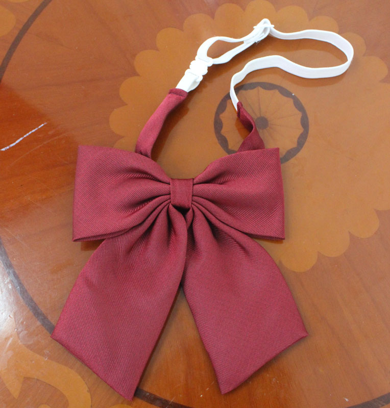 小物使いでおしゃれ度アップ!上品なエンジ色の無地リボン(単品)。 サテンとは一味違う、織り生地タイプのシンプルなリボンは、どんな制服やコスチュームにも合わせやすい万能アイテム!長さ調節可能なゴム紐タイプの制服リボンです。