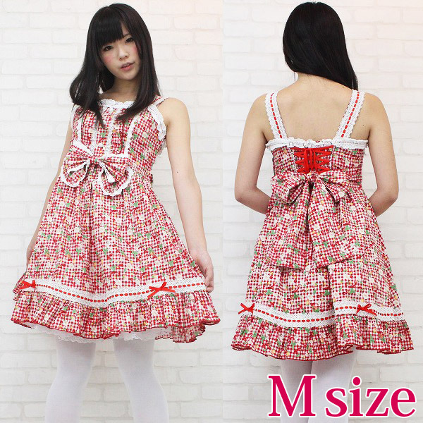 真っ赤なチェリー&ベリーでキュートに仕上げた、ギンガムチェックのジャンパースカート(M)。 たっぷりのフリルとリボンが超ラブリーなコスチューム!フロントの大きなリボンはピンで取り外しが出来るので、お好きなアレンジが楽しめます。 背面は編み上げになっており、リボンは結ぶ仕様となっています。