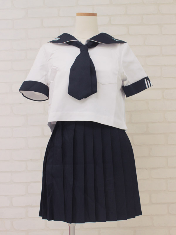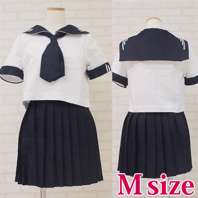 独特の3本ラインがポイントになった、私立女子学園の夏服セーラー服(M)。 半袖セーラーブラウス、プリーツスカート、紺色スカーフのセットです!セーラー襟と袖に入った、個性的な白ラインがお洒落なお嬢様風制服コスプレです。