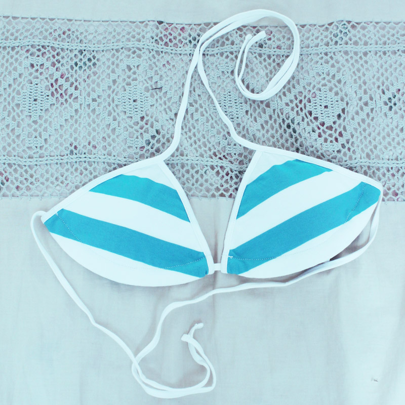 パステルカラーがラブリー!ホルターネックタイプのしましま三角ビキニブラ。 ターコイズ×ホワイトの太めボーダーがとってもキュート!見せブラとして、普段使いやコスプレ衣装にも重宝する優れものです。 ぜひ、しましまパンツとお揃いでどうぞ! ※水洗い可、塩素系漂白剤による漂白不可、アイロンは中温で当て布使用、ドライクリーニング可。