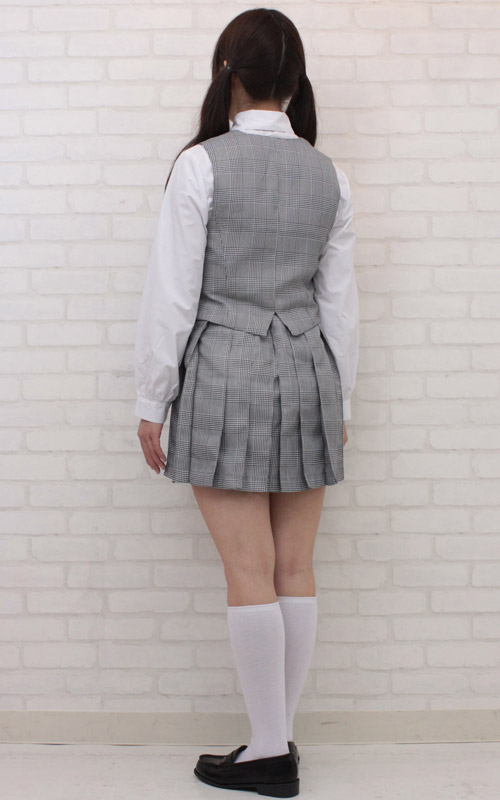 金ボタン付きのベストがポイントになった中間服タイプ!グレーチェックで清楚なお嬢様風に仕上げた制服コスプレ(BIG)。 シャツ、スカート、リボンにベストの豪華4点セット!優等生気分が味わえる、お洒落な制服コスチュームです。