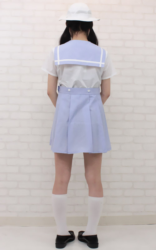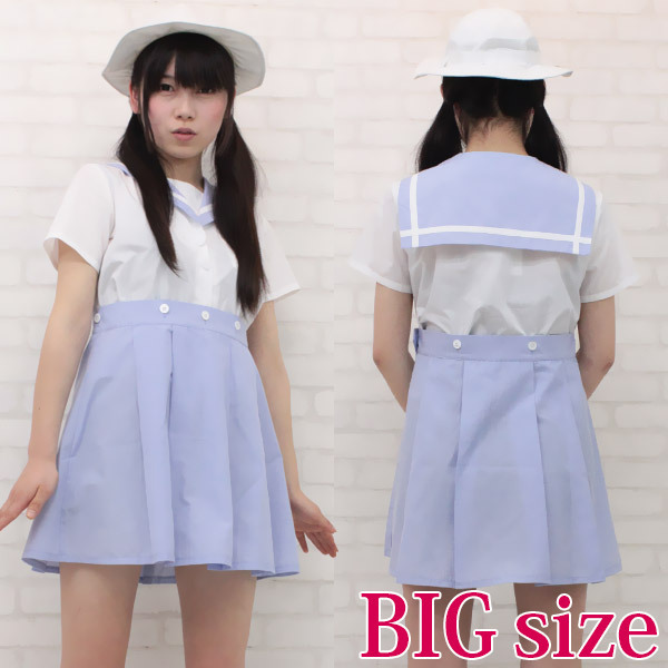 昔懐かしいゴム付き帽子もセット!淡いブルーが爽やかな夏服タイプの制服コスプレ(BIG)。 セーラー襟の付いた半袖シャツとスカートは、ボタンで繋ぐことが可能!こだわりデザインのキュートな制服コスチュームです。