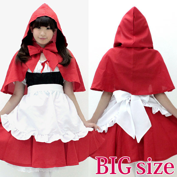 ハロウィンの仮装にもぴったり!めちゃカワ赤ずきんちゃんのコスプレ衣装(BIG)。 トレードマークの赤頭巾はフード付きのふんわりケープ型!キュっと結んだ大きめリボンがポイントです。 後ろファスナー仕様のワンピースは単品で着てもキュート!フリルエプロンも付属した豪華3点セットです。