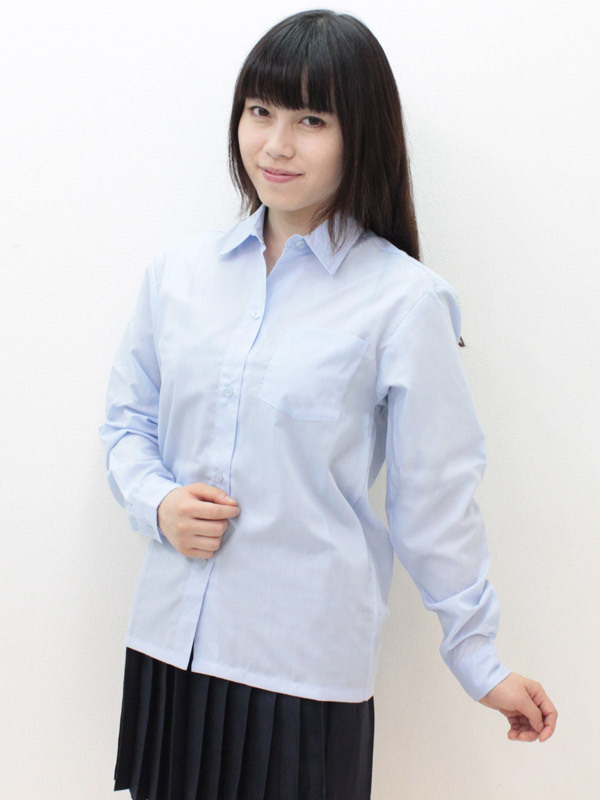 白シャツとは異なる魅力!パリッと着こなしたいサックスカラーの長袖シャツ単品。 手持ちの制服コスチュームを、これ1つでマイナーチェンジ!このポケットつきのトップスは、ストレート裾なのでスカートの上に出して着用しても似合います。