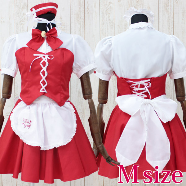 苺ショートケーキ風?!赤と白の甘いテイストで着こなすスイーツ系のメイドコスチューム。 有名なカフェのオフィシャル制服!白い半袖ブラウスにレースアップビスチェがセクシー!大きな後ろリボンが可愛い丸エプロン、フレアスカートの下にはレースペチコート、襟にはカメオ付きリボンブローチをトッピング!そしてヘアアクセはカチューシャとミニセーラー帽のどちらも楽しめるメイドコスプレの豪華8点セットです。