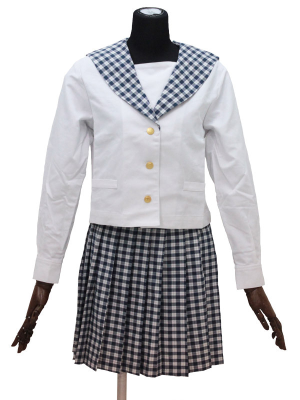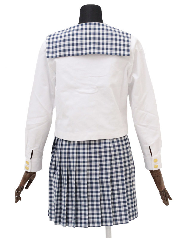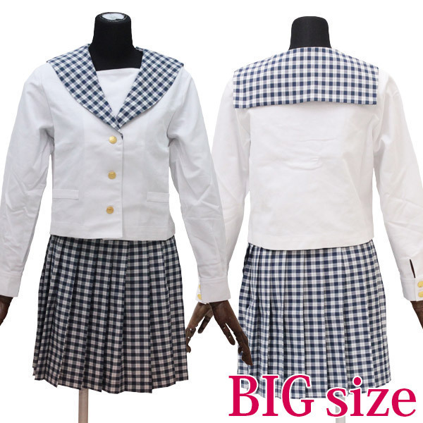 フロントと袖口の金ボタンがポイント!紺色ギンガムチェックのセーラー服コスプレ。 ●オールシーズン対応可能な長袖の中間服●短め丈のセーラーブラウスは前開きボタン仕様●胸当てはスナップボタンで取り外し可●プリーツスカートのウエストはアジャスター調整式●大きいさんも着られるBIGサイズ。 お嬢様学校風にとことん可愛らしく仕上げた制服コスチュームです。