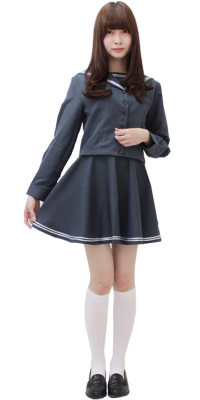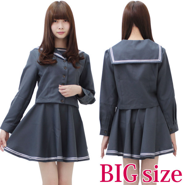 チャコールグレーに白のダブルラインが珍しい!有名学校の制服コスチューム。 ●BIGサイズだからぽっちゃりさんや女装男子も着用可能●長袖セーラートップスはフロントボタン開き●フレアスカートがプリーツでは出せない素敵なシルエットを作ります。 スカーフやネクタイなしで着るシンプルデザインが逆にカッコよく感じるセーラー服です。