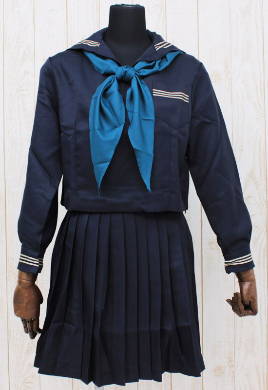 セーラー襟の切り替えデザインがオシャレなセーラー服コスチューム。 ●長袖セーラーブラウス&プリーツスカートは定番の紺色●襟・袖・胸ポケットにシルバーグレーの3本ライン入り●グリーン系の可愛いスカーフ。 切り替え襟のデザインを引き立たせる為に、スカーフは首元近くで結んで長めに垂らすのがポイント!襟の角で交差した細かなラインデザインなど、随所にこだわりを感じるリアルな制服コスプレです。
