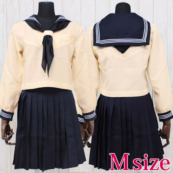 胸当てなし・Vネックラインで襟元スッキリ!大人っぽさが香るセーラーコスプレ。 ●切り替えデザインが珍しい・クリーム色に紺が映える長袖セーラートップス●袖口と襟には白い3本ライン入り●セクシー感控え目・細かいプリーツの膝丈濃紺スカート●後襟からのぞく三角形が可愛い黒スカーフ。 襟とスカーフのバランスがよいお洒落な制服コスチュームです。