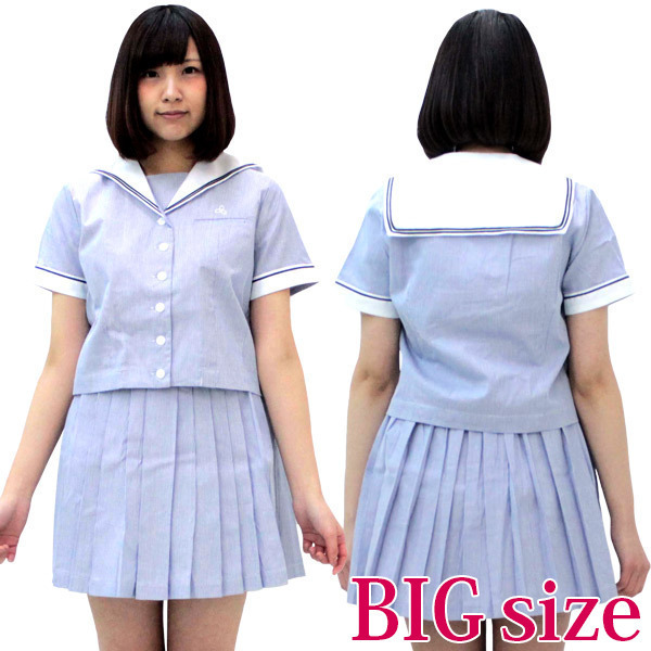 セーラーシャツが新鮮♪憧れのお嬢様風、夏用セーラー服のコスプレセット。 ●風薫る爽やかな水色●お嬢様な半袖トップス●セーラ襟と袖に黒ライン入り●胸当てはスナップボタン留め●アジャスター付きプリーツスカート●ゆったり大きめBIGサイズ。 珍しいデザインが目を引くセーラー服コスチュームです。
