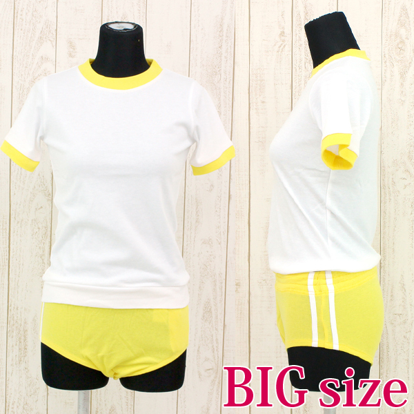 BIGサイズ B96〜110cm・W〜90cm(伸縮時最大114cm)・H〜100cm 上衣:着丈58cm・肩幅39cm・袖丈21cm ブルマ:股上丈32cm セット内容:上衣、ブルマ 素材:ポリエステル65%、コットン35%