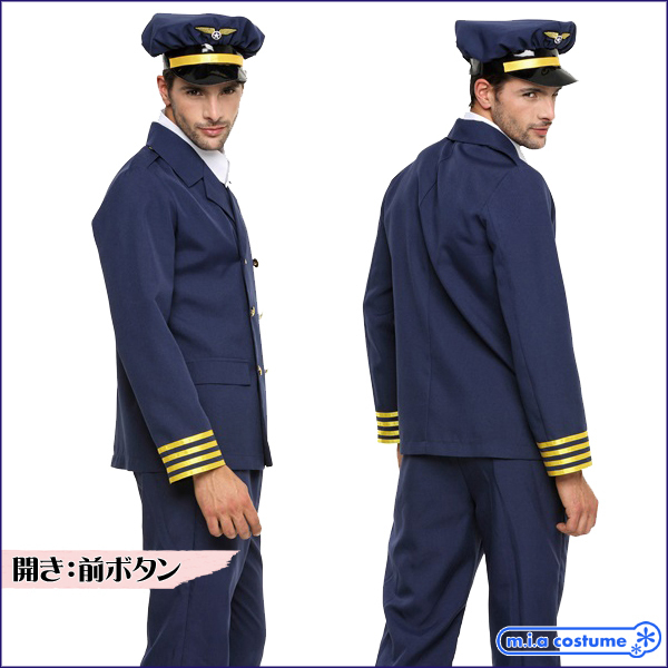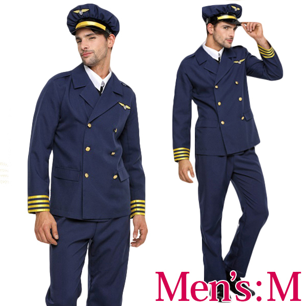 ハロウィンの夜はお洒落に決める♪憧れのパイロットになりきれる格好いい機長コスプレ。 落ち着きのある紺の制服にゴールドカラーがアクセント!最高にCOOLな男を演出してくれるメンズ用のパイロット風ハロウィンコスプレ♪ジャケットは着脱しやすい前ボタン仕様、付襟やネクタイなど小物付き。