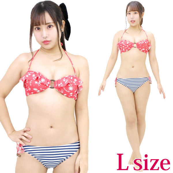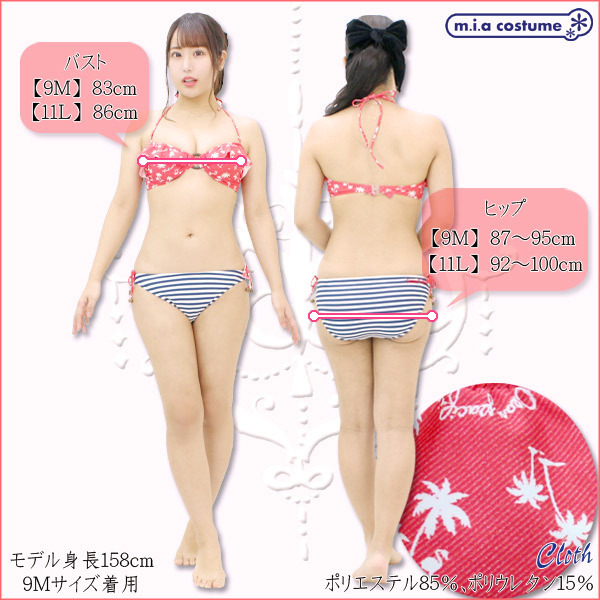 11Lサイズ:B86cm・H87〜95cm セット内容:トップス(パッド着脱可、ワイヤー無し)、ビキニショーツ 素材:ポリエステル85%、ポリウレタン15% 生産国:日本