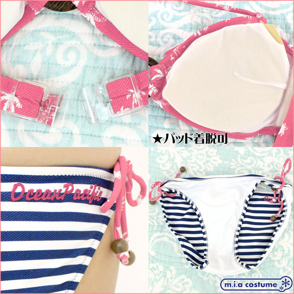 海やプール、水遊びで着たい!夏気分を盛り上げるマリン柄ビキニ水着2点セット(赤)。 ホルターネック仕様のブラにはヤシの木柄を取り入れ、ショーツには爽やかな青白ボーダーをプリントすることで南国風にまとめた一着♪ブラは着脱可能なパッド付き、日本製 ※手洗い可(水温30度)、塩素系漂白剤、アイロン、ドライクリーニング不可、色落ちの可能性があります。