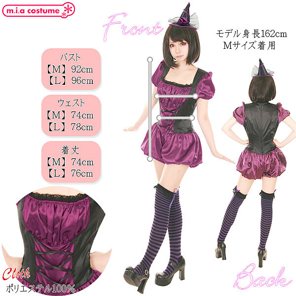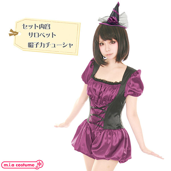ハロウィンパーティにもってこい♪ダークポップに仕上げた可愛い魔女コスプレ大きめサイズ。 光沢のあるサテン風の生地を使用したサロペットに、三角帽子が付いたカチューシャのセット商品♪パフ袖や丸みのあるかぼちゃパンツがとってもキュートなデザインです。 元気な魔女っ娘になりきってハロウィンを楽しもう! ※塩素系漂白剤による漂白不可、洗濯の際はリボンなどの付属品を外し個々単独での手洗いをお願いします、色落ちの可能性があります。