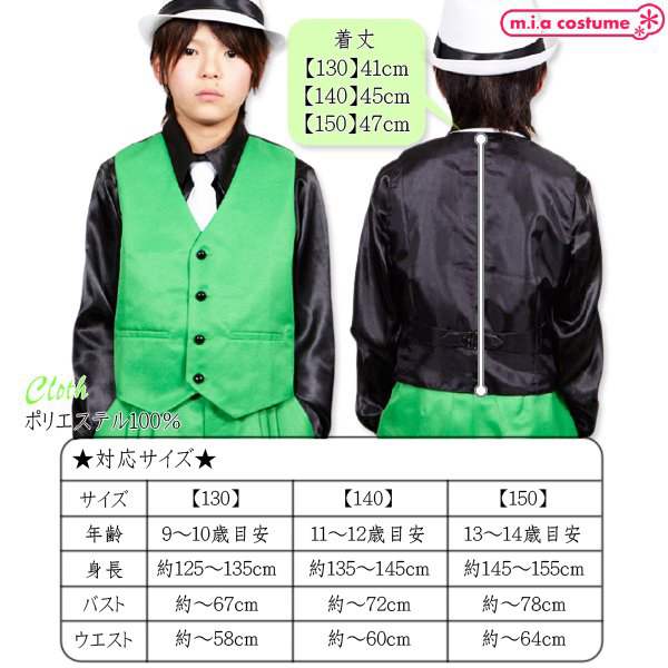 150サイズ 対応サイズ:身長145〜155cm・B〜78cm・W〜64cm 実寸:着丈47cm セット内容:ベスト単品(前ボタン) 素材:ポリエステル100%