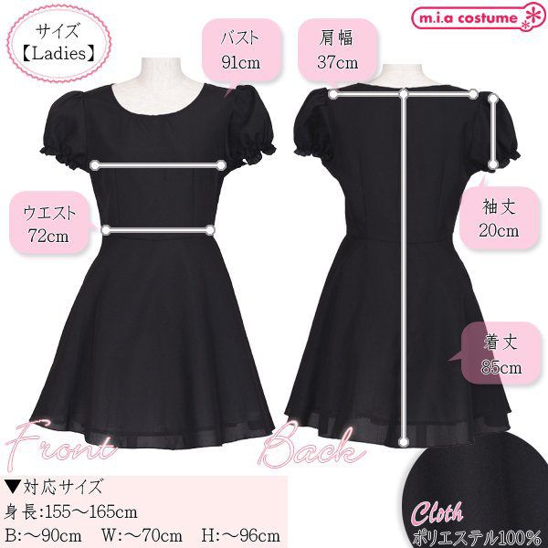 対応サイズ:身長155〜165cm・B〜90cm・W〜70cm・H〜96cm 実寸:B91cm・W72cm・肩幅37cm・袖丈20cm・着丈85cm セット内容:ワンピース単品(背中心ファスナー) 素材:ポリエステル100% モデル身長155cm