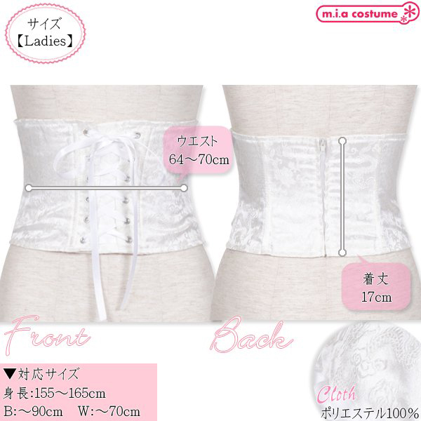対応サイズ:身長155〜165cm・B〜90cm・W〜70cm 実寸:W64〜70cm・着丈17cm セット内容:コルセット単品(背中心ファスナー) 素材:ポリエステル100% モデル身長155cm