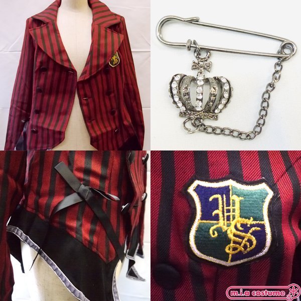ワッペン付きで前ボタンのジャケットにブローチが付属!男性の夜間の礼服である燕尾服の様な裾がポイントの「マッケンジー ワッペン付きストライプジャケット」です♪舞台用のステージ衣装やV系・ヴィジュアル系の衣装としても、プレゼント用にも良さげ!アンティークなダブルボタンのストライプ柄ジャケットだから、おしゃれに着こなせてパンツはもちろん、パニエを履いて可愛く着こなしても◎仮装イベントや学園祭にもおすすめです。