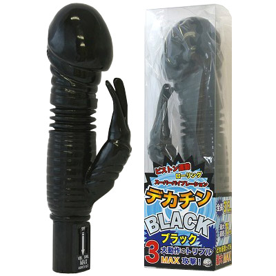 三度の飯より巨根好き!…という貴女に持ってこいの超超超極太モンスターバイブ!その名も「デカチンBLACK」。 全長315mm、最大直径75mmという見た目の迫力もさることながら、機能面においてもピストン運動&ローリング&スーパーバイブレーションのトリプルMAX攻撃が可能!挿入せずに快感ポイントに当てるだけでもKO確実!